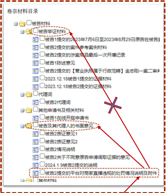 (4)《卷宗》并无此证据——《平台对商家直播违规的处罚截图》(下图网络卷宗目录,原告无提供原文能力也无提供义务,列出只为审者方便,不信可依职权调取)。