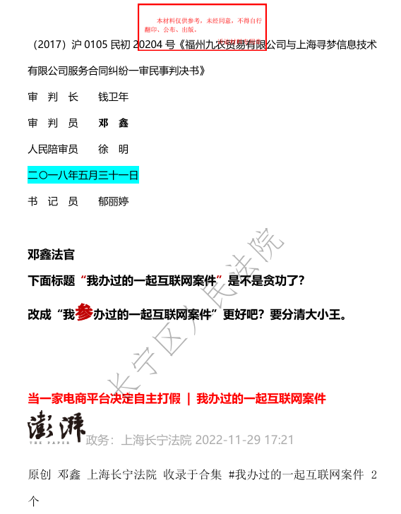 《判决书》第19页,“本院注意到,原告多次提及低价购买高价商品的案例。一方面,两案案情并非完全一致,…… 《最高人民法院关于统一法律适用加强类案检索的指导意见》“一、本意见所称类案,是指与待决案件在基本事实、争议焦点、法律适用问题等方面具有相似性,且已经人民法院裁判生效的案件。”“六、承办法官应当将待决案件与检索结果进行相似性识别和比对,确定是否属于类案。”
